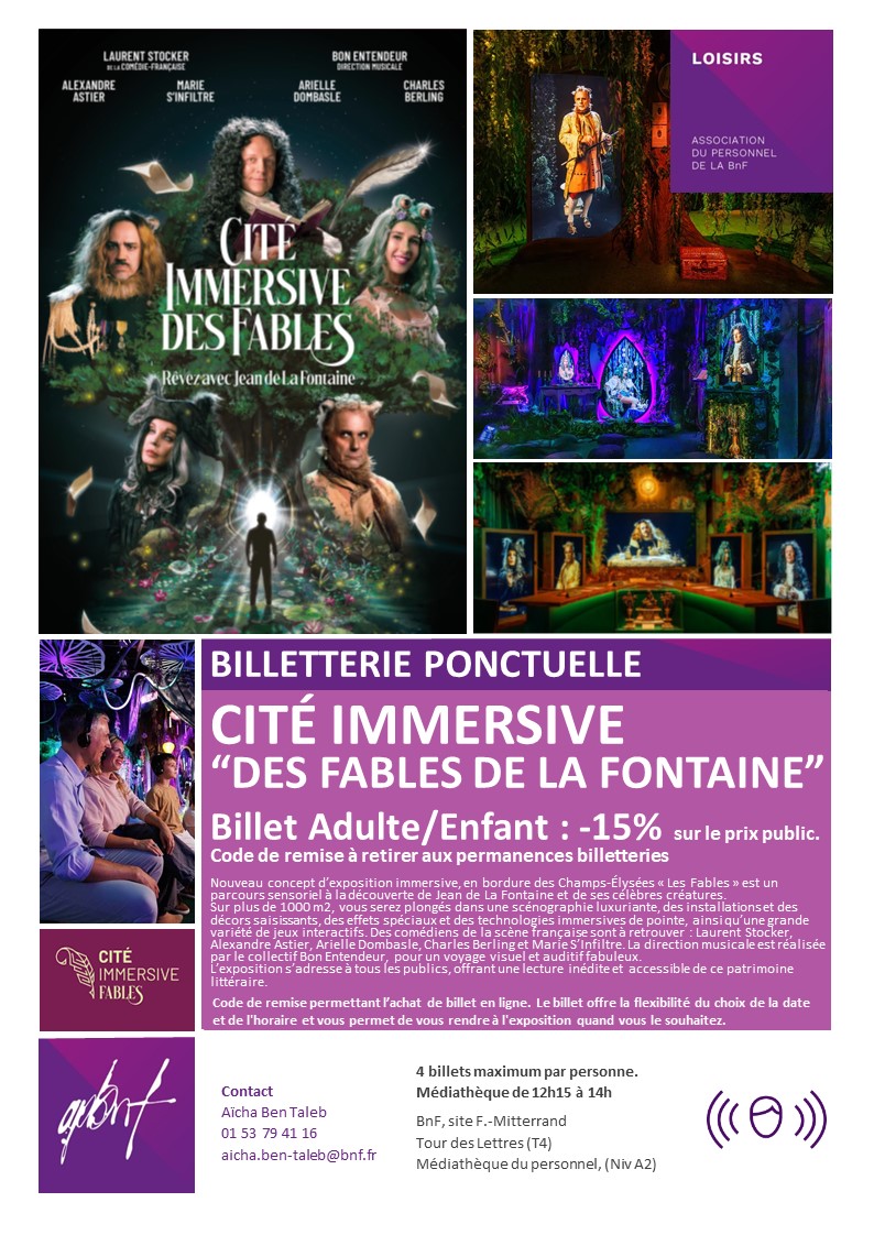 L’APBnF vous propose des billets à tarifs préférentiels pour la Cité Immersive des Fables de La Fontaine. Billet Adulte/Enfant : -15% sur le…