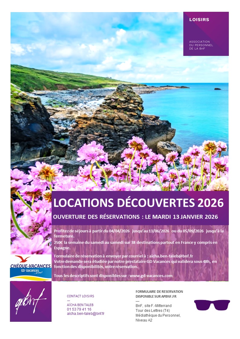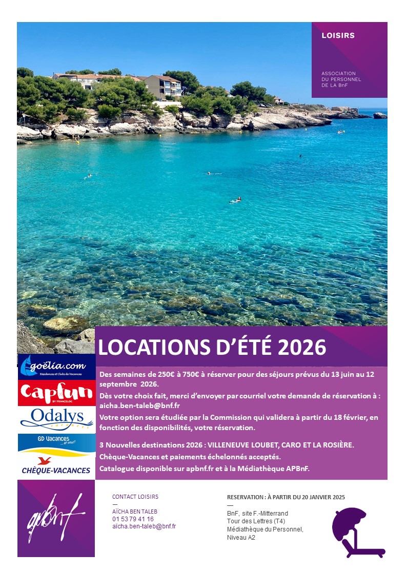 L’APBnF vous propose des locations de vacances en France du 13 juin au 12 septembre 2026, à tarif préférentiel sur 7 destinations de 250€ …