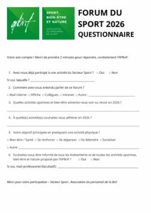 Prenez 2 minutes pour répondre à notre questionnaire du forum des activités physiques et sportives 2026. Ce document est à imprimer, remplir et déposer à l’accueil de notre salle omnisports.